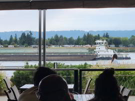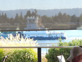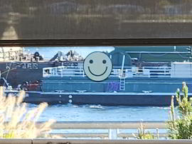 A barge goes by the Vancouver Waterfont on the Columbia River with a big smiley face!